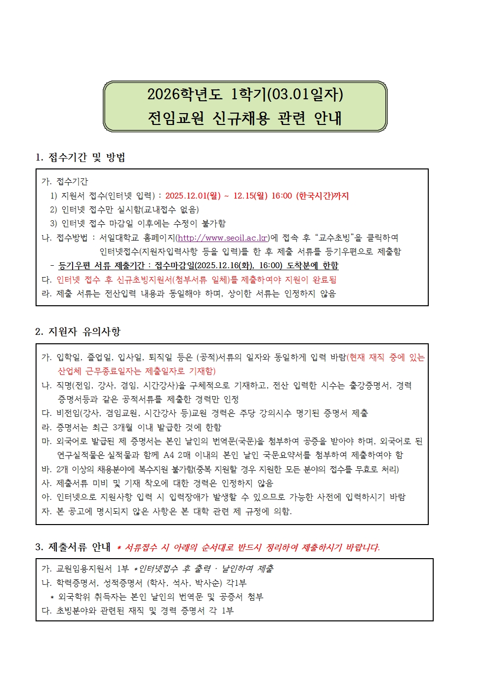 2026학년도 1학기(03.01.자) 전임교원 신규채용 관련 안내